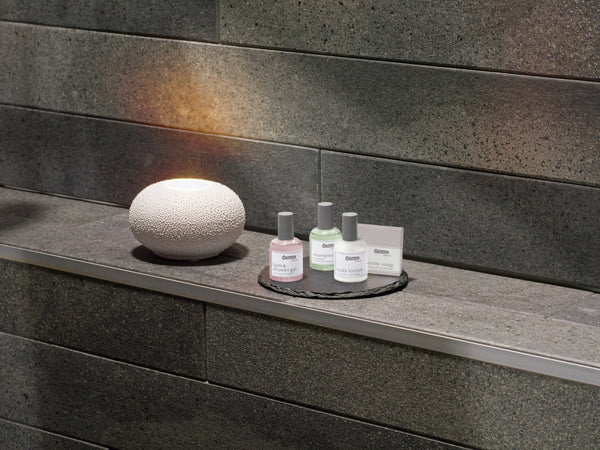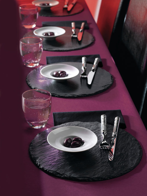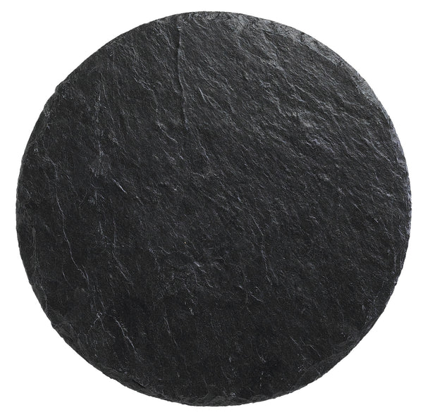 Okrągła taca z naturalnego łupka, bez uchwytu. Gumowe nóżki zapobiegają ślizganiu się po stole. Nie nadaje się do mycia w zmywarce.