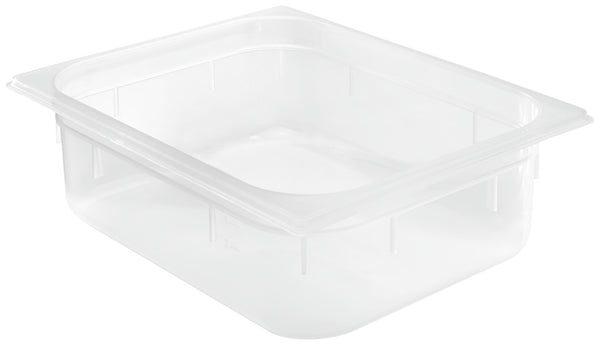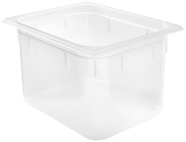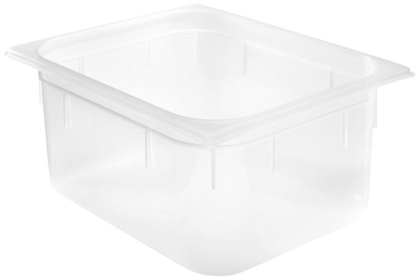 Prostokątny plastikowy pojemnik GN 1/2 wykonany z bezpiecznego dla żywności polipropylenu. Odporny na uderzenia i bardzo wytrzymały. Przezroczysty, dzięki czemu zawartość jest łatwo rozpoznawalna z zewnątrz. Uniwersalne zastosowanie w temperaturach od -40 °C do +95 °C. Oznaczenia napełnienia na zewnątrz. Pojemność 9,8 litra. Dostarczany bez pokrywki i tacki ociekowej. Nie zawiera bisfenolu A. Można myć w zmywarce.