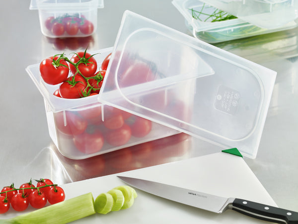 Prostokątny plastikowy pojemnik GN 1/3 wykonany z bezpiecznego dla żywności polipropylenu. Odporny na uderzenia i bardzo wytrzymały. Przezroczysty, dzięki czemu zawartość jest łatwo rozpoznawalna z zewnątrz. Uniwersalne zastosowanie w temperaturach od -40 °C do +95 °C. Oznaczenia napełnienia na zewnątrz. Pojemność 9,8 litra. Dostarczany bez pokrywki i tacki ociekowej. Nie zawiera bisfenolu A. Można myć w zmywarce.