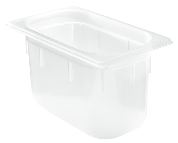 Prostokątny plastikowy pojemnik GN 1/4 wykonany z bezpiecznego dla żywności polipropylenu. Odporny na uderzenia i bardzo wytrzymały. Przezroczysty, dzięki czemu zawartość jest łatwo rozpoznawalna z zewnątrz. Uniwersalne zastosowanie w temperaturach od -40 °C do +95 °C. Oznaczenia napełnienia na zewnątrz. Pojemność 9,8 litra. Dostarczany bez pokrywki i tacki ociekowej. Nie zawiera bisfenolu A. Można myć w zmywarce.