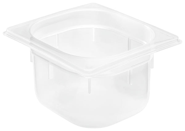 Prostokątny plastikowy pojemnik GN 1/6 wykonany z bezpiecznego dla żywności polipropylenu. Odporny na uderzenia i bardzo wytrzymały. Przezroczysty, dzięki czemu zawartość jest łatwo rozpoznawalna z zewnątrz. Uniwersalne zastosowanie w temperaturach od -40 °C do +95 °C. Oznaczenia napełnienia na zewnątrz. Pojemność 9,8 litra. Dostarczany bez pokrywki i tacki ociekowej. Nie zawiera bisfenolu A. Można myć w zmywarce.