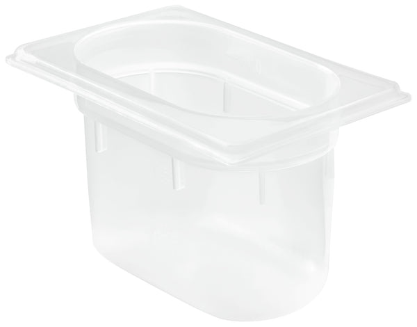 Prostokątny plastikowy pojemnik GN 1/9 wykonany z bezpiecznego dla żywności polipropylenu. Odporny na uderzenia i bardzo wytrzymały. Przezroczysty, dzięki czemu zawartość jest łatwo rozpoznawalna z zewnątrz. Uniwersalne zastosowanie w temperaturach od -40 °C do +95 °C. Oznaczenia napełnienia na zewnątrz. Pojemność 9,8 litra. Dostarczany bez pokrywki i tacki ociekowej. Nie zawiera bisfenolu A. Można myć w zmywarce.