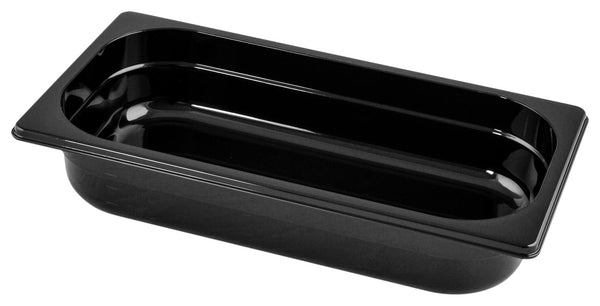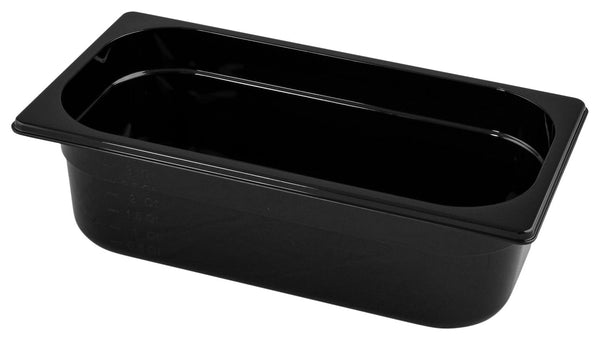 Pojemnik GN 1/3 wykonany z czarnego, bezpiecznego dla żywności Tritanu (kopoliester). Odporny na wstrząsy i nadający się do sztaplowania. Zakres zastosowania od -40 °C do +90 °C. Z podziałką litrową. Bez bisfenolu A. Można myć w zmywarce.