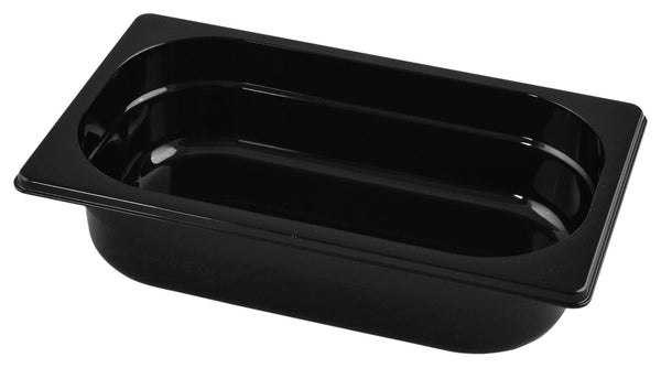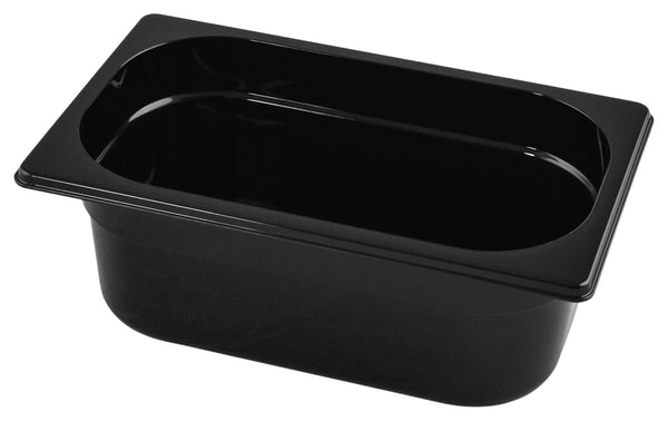 Pojemnik GN 1/4 wykonany z czarnego, bezpiecznego dla żywności Tritanu (kopoliester). Odporny na wstrząsy i nadający się do sztaplowania. Zakres zastosowania od -40 °C do +90 °C. Z podziałką litrową. Bez bisfenolu A. Można myć w zmywarce.