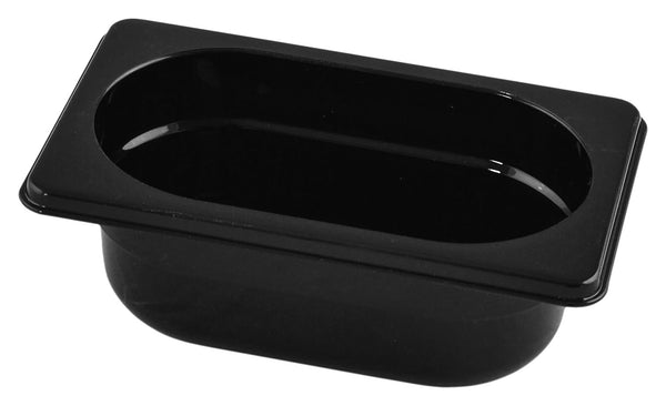Pojemnik GN 1/9 wykonany z czarnego, bezpiecznego dla żywności Tritanu (kopoliester). Odporny na uderzenia i nadający się do sztaplowania. Zakres zastosowania od -40 °C do +90 °C. Z podziałką litrową. Bez bisfenolu A. Można myć w zmywarce.