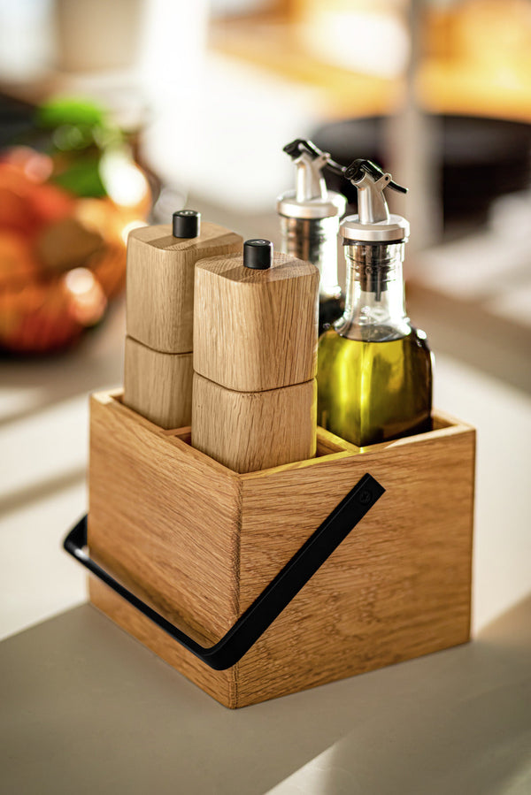 Pojemnik na sztućce wykonany z drewna dębowego ze składanym uchwytem ze stali malowanej proszkowo. Plastikowa mata na podstawie zapobiega zabrudzeniu drewna i można ją zdjąć w celu wyczyszczenia. Dwie małe przegrody (6x6 cm) i jeden duża (12,8x6 cm). Nie nadaje się do mycia w zmywarce.