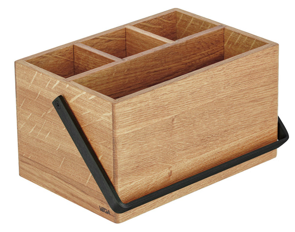 Pojemnik na sztućce wykonany z drewna dębowego ze składanym uchwytem ze stali nierdzewnej. Plastikowa mata na spodzie zapobiega zabrudzeniu drewna i można ją wyjąć do czyszczenia. Trzy małe przegródki (6x6 cm) i jedna duża przegroda (19x6 cm). Nie nadaje się do mycia w zmywarce.