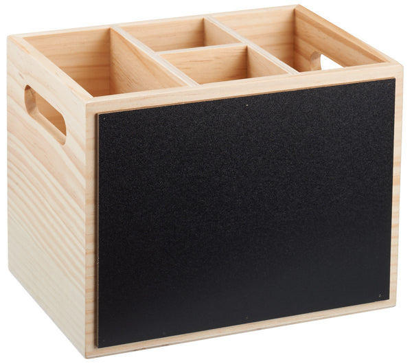 Sosnowy stojak na sztućce z dwiema tablicami do pisania po bokach o wymiarach 19,5x14,5 cm. Cztery wewnętrzne przegródki na sztućce, serwetki i inne przybory stołowe oraz dwa wycięcia na uchwyty. Impregnacja bezpieczna dla żywności. Drewniane przedmioty nie nadają się do mycia w zmywarce.