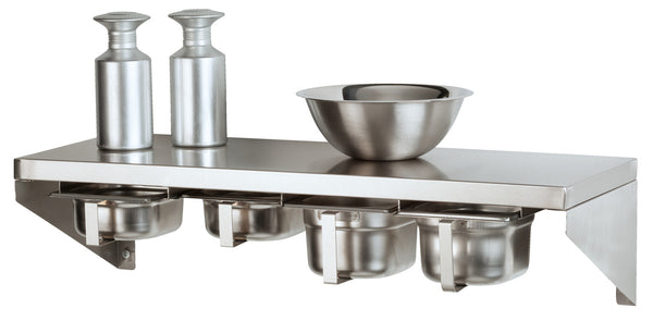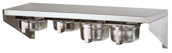 Praktyczna półka ścienna z prowadnicami na pojemniki na przyprawy 4x1/6 GN ze stali nierdzewnej. Grubość materiału 0,8 mm. Wraz z materiałem montażowym. Można myć w zmywarce. Dostarczana bez wkładów i dekoracji.