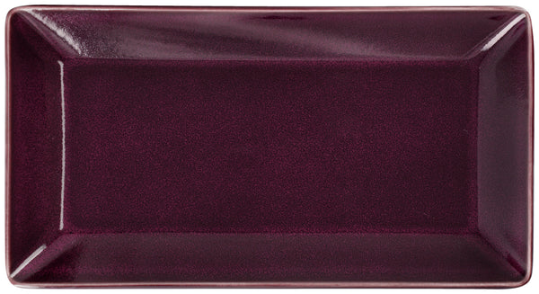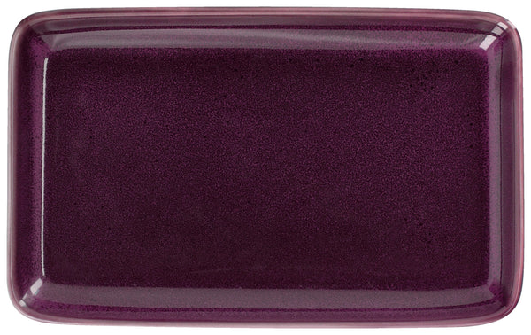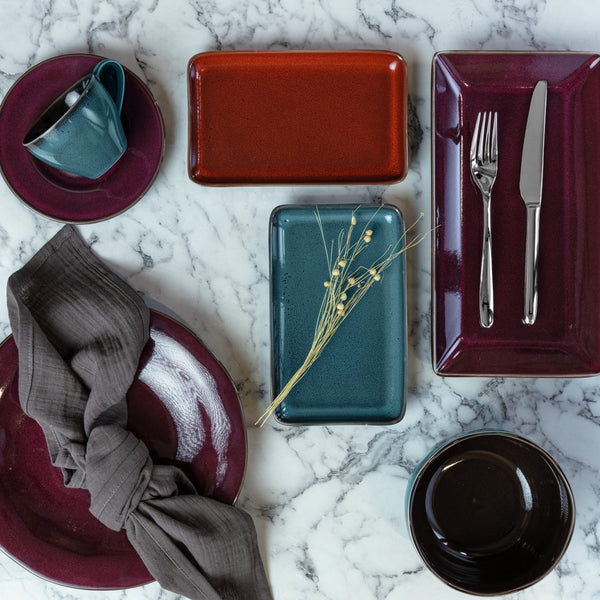 Talerz z kolorowej kamionki. Z nieregularnymi brzegami i plamkami. Każdy element jest unikatowy. Można myć w zmywarce i używać w kuchence mikrofalowej.