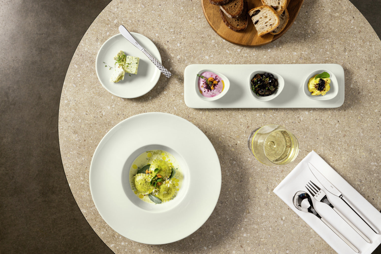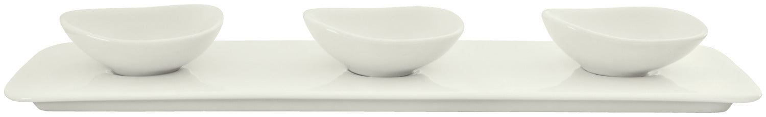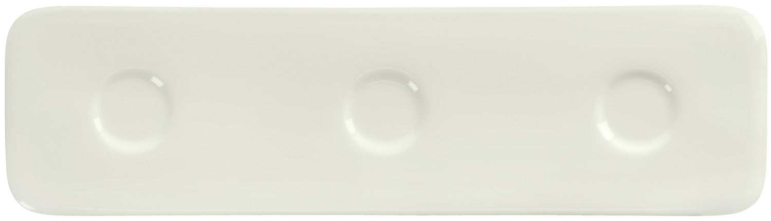 Półmisek do serwowania z wgłębieniem wykonany z porcelany o lekko kremowym kolorze. Nowoczesny design z wyraźnymi liniami. Wysoka odporność. Wspaniałe szkliwo. Można myć w zmywarce i używać w kuchence mikrofalowej. Zamów jednocześnie pasujące miski.
