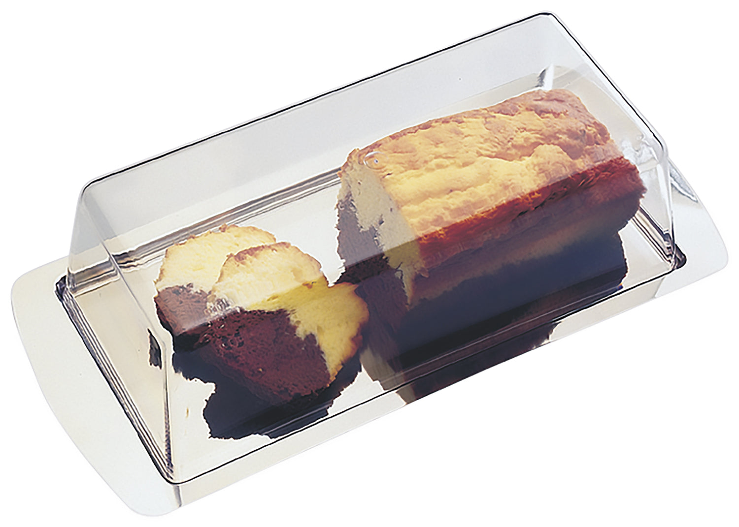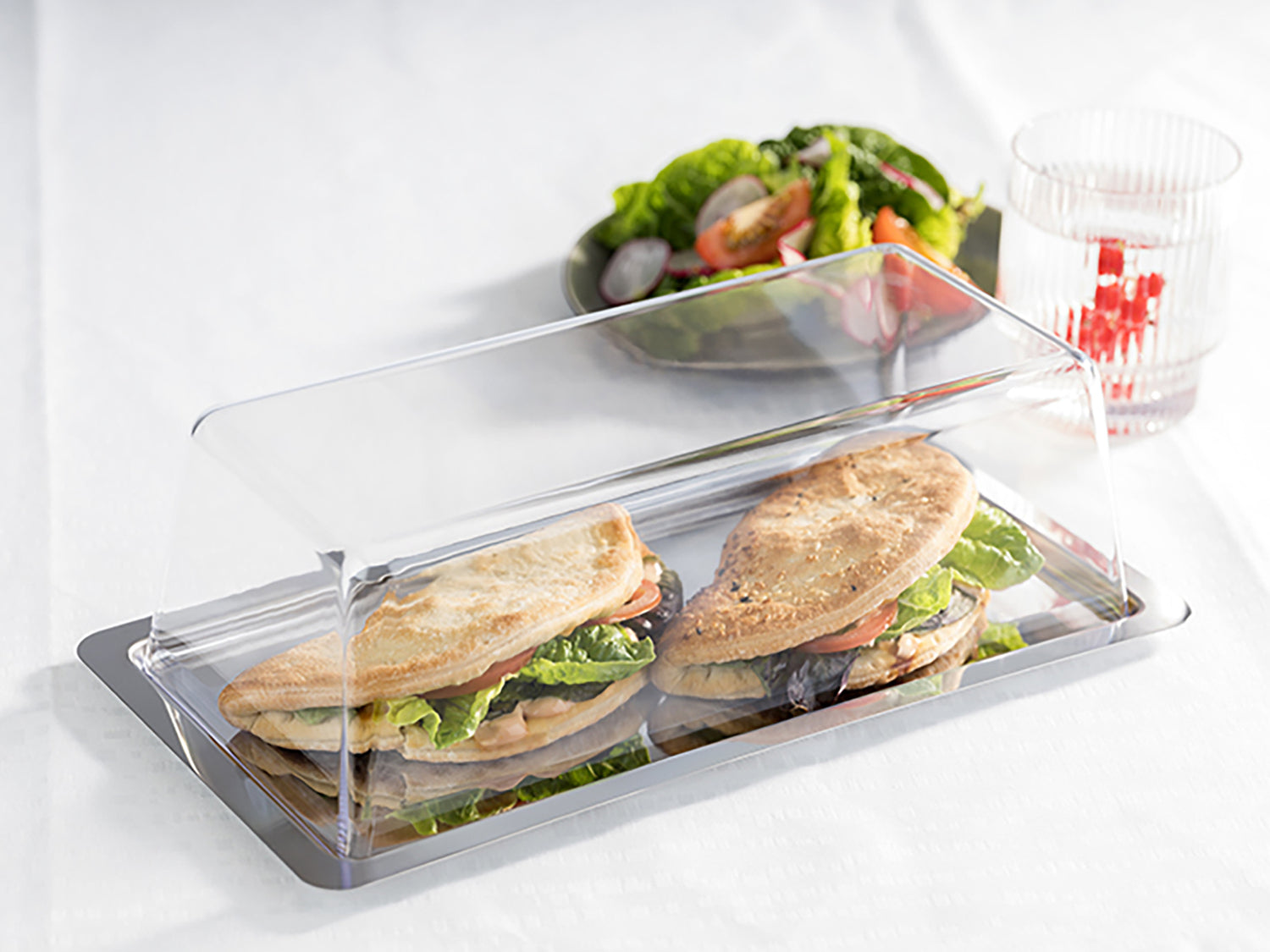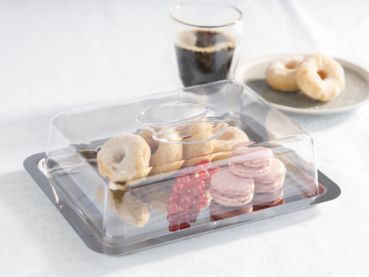 Taca wykonana ze stali nierdzewnej, z przezroczystą pokrywą.