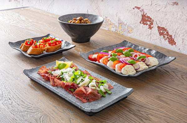 Kwadratowy półmisek z melaminy imitującej kamień. Szczególnie trwały i wytrzymały dzięki wysokiej odporności na uderzenia i pęknięcia. Zakres temperaturowy od -30°C do +70°C. Możliwość układania w stosy i mycia w zmywarce. Nieodporny na przecięcia.
