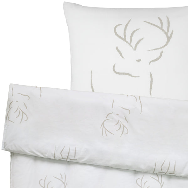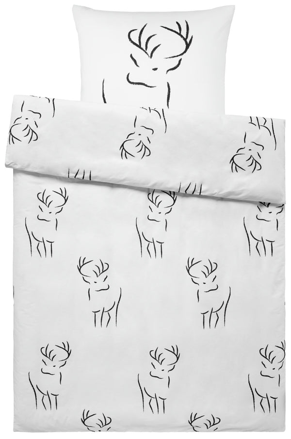 Miękka bawełniana pościel z nadrukowanym wzorem jelenia. Zestaw pościeli z wytrzymałym zamkiem błyskawicznym. Pościel osiąga określony rozmiar po trzech praniach. Gęstość nici: 144 nici na cal Rodzaj splotu: Perkal 100% bawełna. Gramatura ok. 110 g/m².