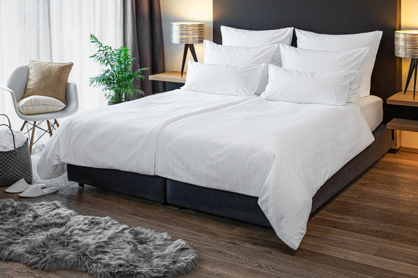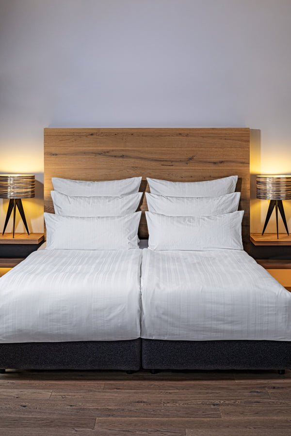 Poszwa na kołdrę z wytrzymałego adamaszku. Z zamknięciem hotelowym w celu szybkiej zmiany pościeli. Skład: 80% bawełna, 20% poliester. Prać w 95°, odporna na chlor. Gramatura ok. 130 g/m2.