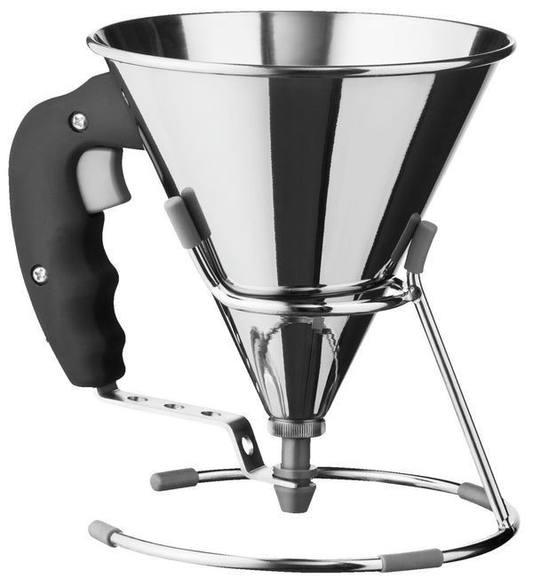 Mini lejek do pomad wykonany ze stali nierdzewnej chromowo-niklowej 18/0. Ergonomicznie ukształtowany uchwyt z poliamidu. Prosty mechanizm pchający. Otwór wylotowy Ø 7 mm - w zestawie podstawka z antypoślizgową powłoką silikonową. Można myć w zmywarce.