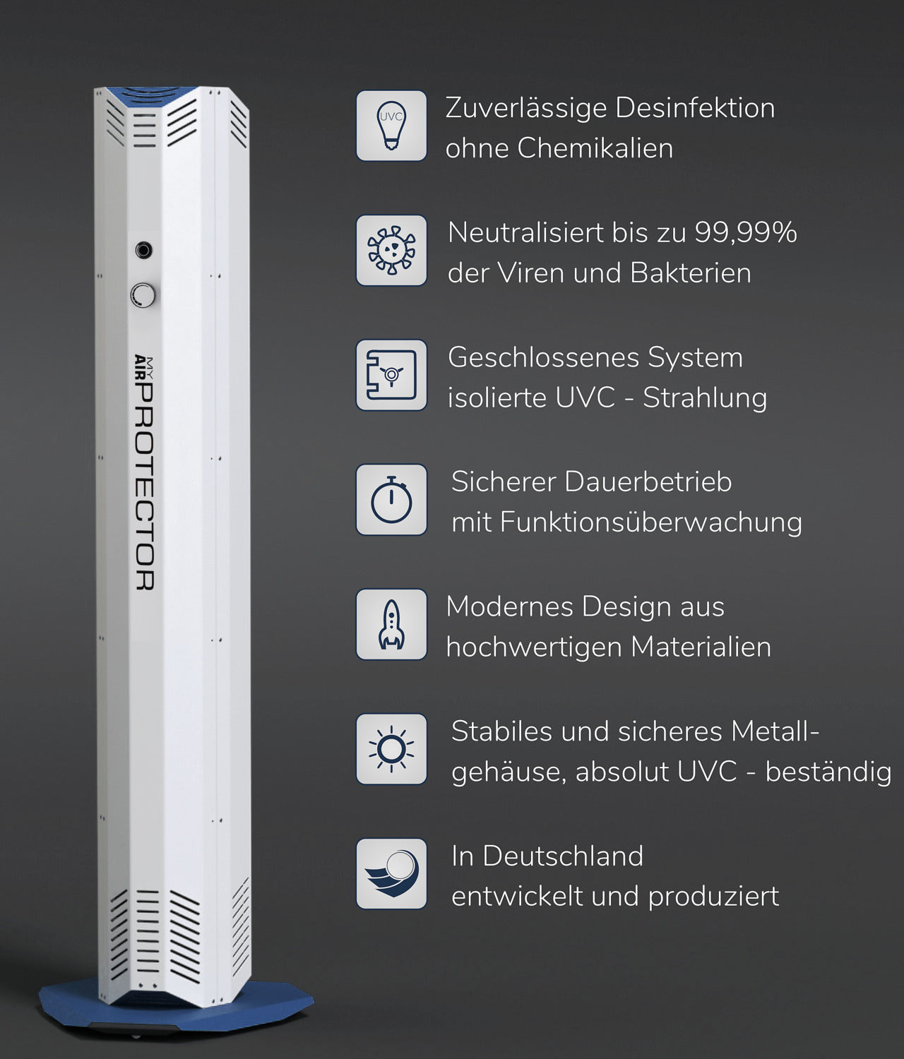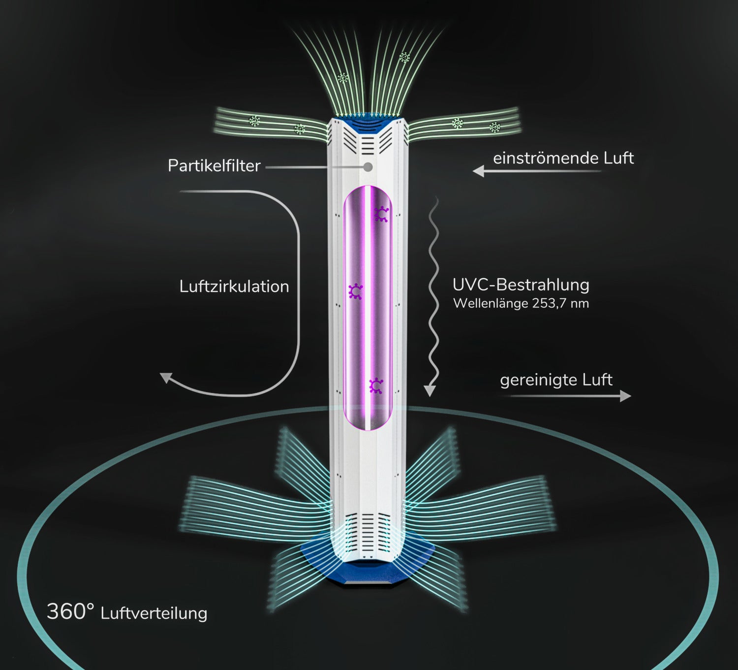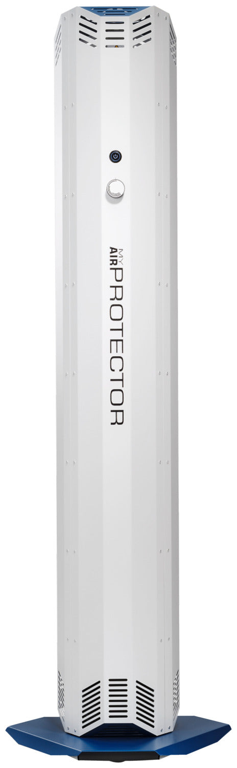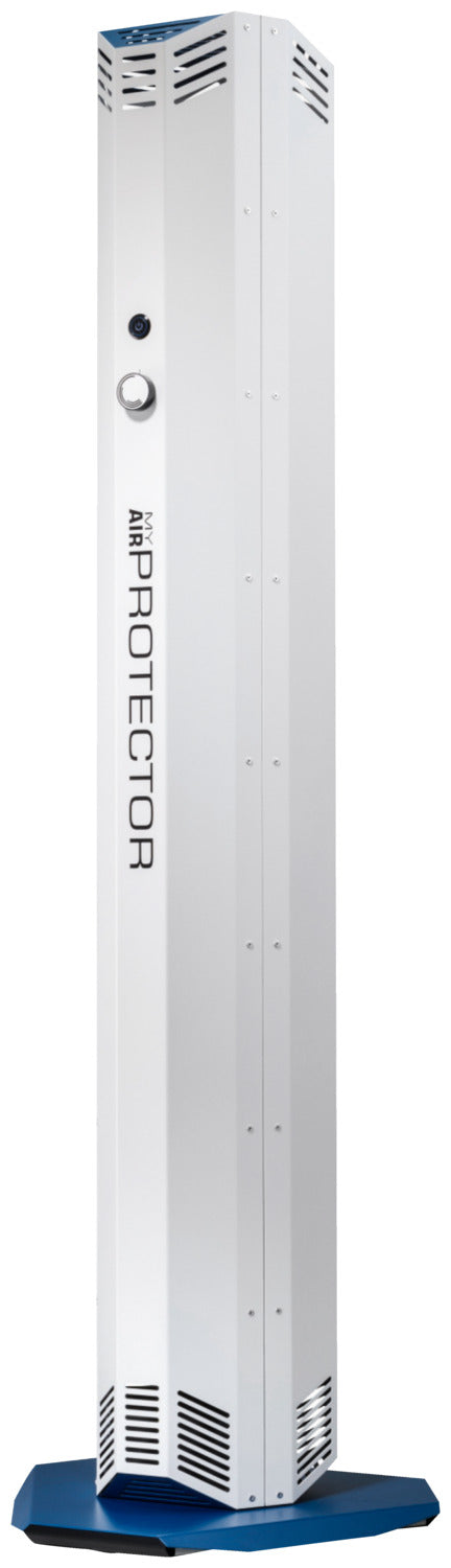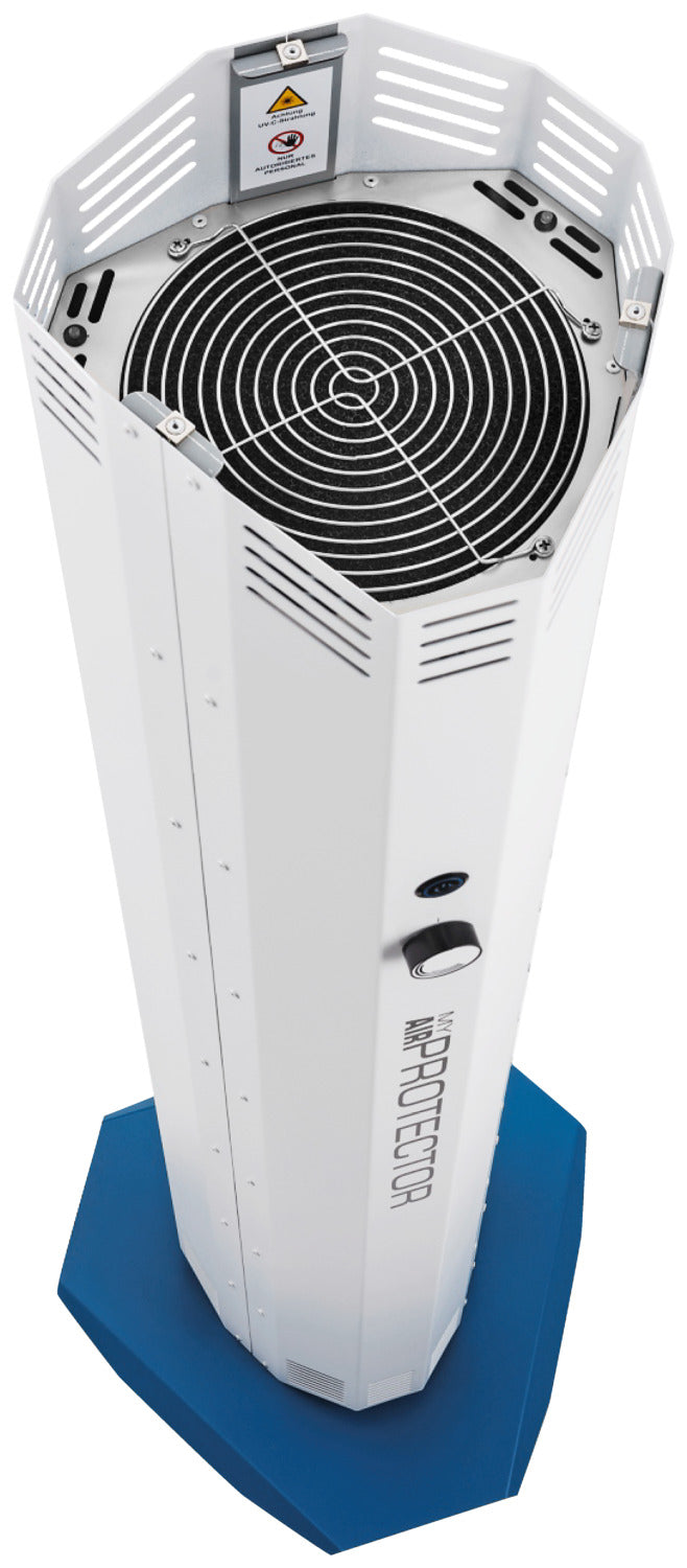 * desinfiziert die Raumluft mit Hilfe von UV-C-Strahlung. * Die Umgebungsluft wird angesaugt und isoliert mit einer hohen Dosis UV-C-Licht bestrahlt. * UVC-Licht ist eine zuverlässige, umweltfreundliche und unbedenkliche Art der Desinfektion. * Eingebauter Partikelfilter gegen Blütenstaub, Haaren, Pollen, Hausstaub, Sporen und Insekten. * Reinigt bis zu 400 m³ Luft pro Stunde. Lautstärke von 38 dBA bis 57 dBA (maximale Stufe). * Geeignet für einen dauerhaften Einsatz in geschlossen Räumen. * Einfache Installation und Bedienung. * Stabiles, sicheres Gehäuse aus Metall mit Rollen am Standfuß. * Maße inklusive Standfuß. Netzkabel 1,90 m lang. * Lebensdauer der UVC-Lampen 9.000 Stunden. * 2 Jahre Garantie.