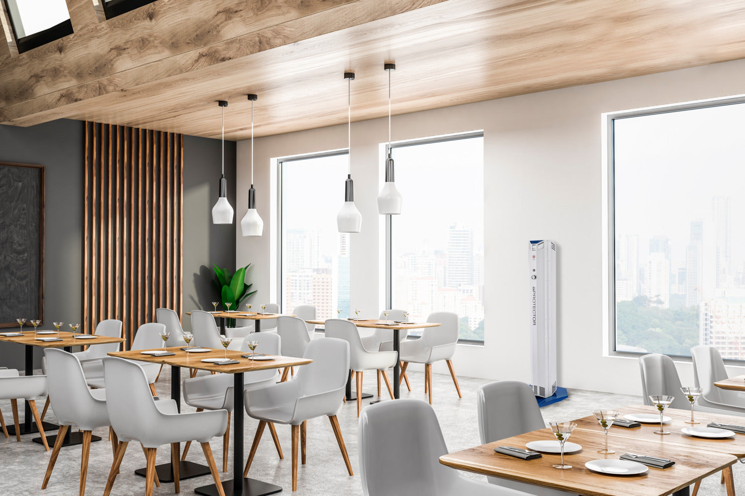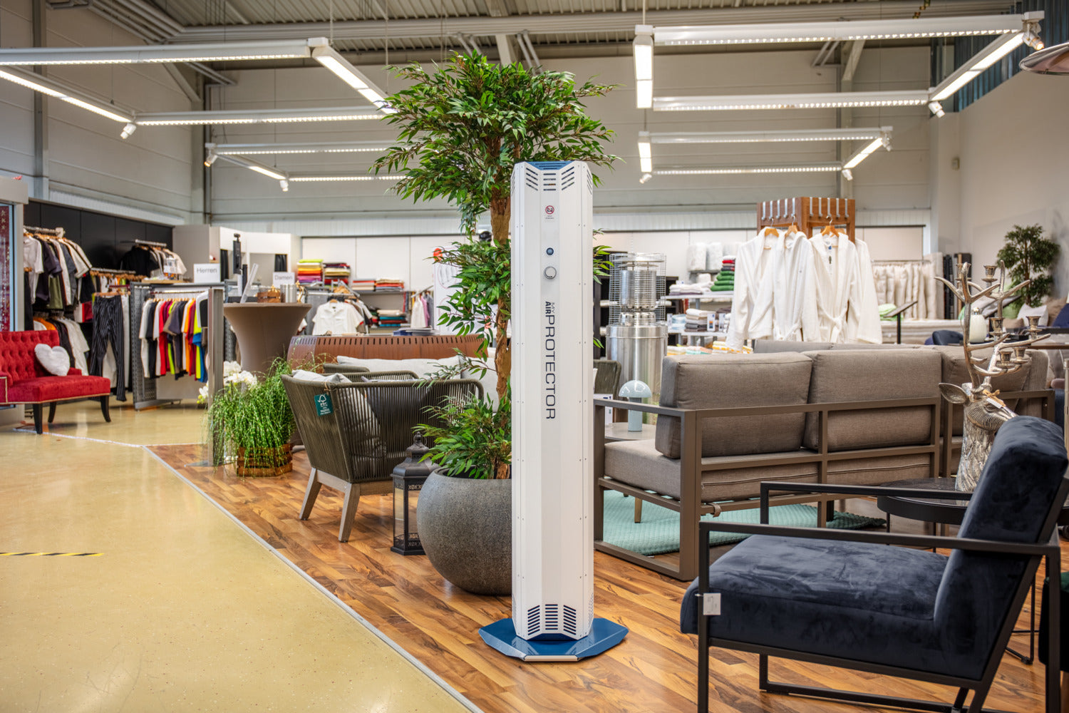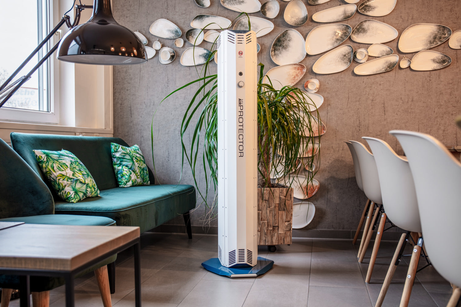* desinfiziert die Raumluft mit Hilfe von UV-C-Strahlung. * Die Umgebungsluft wird angesaugt und isoliert mit einer hohen Dosis UV-C-Licht bestrahlt. * UVC-Licht ist eine zuverlässige, umweltfreundliche und unbedenkliche Art der Desinfektion. * Eingebauter Partikelfilter gegen Blütenstaub, Haaren, Pollen, Hausstaub, Sporen und Insekten. * Reinigt bis zu 400 m³ Luft pro Stunde. Lautstärke von 38 dBA bis 57 dBA (maximale Stufe). * Geeignet für einen dauerhaften Einsatz in geschlossen Räumen. * Einfache Installation und Bedienung. * Stabiles, sicheres Gehäuse aus Metall mit Rollen am Standfuß. * Maße inklusive Standfuß. Netzkabel 1,90 m lang. * Lebensdauer der UVC-Lampen 9.000 Stunden. * 2 Jahre Garantie.