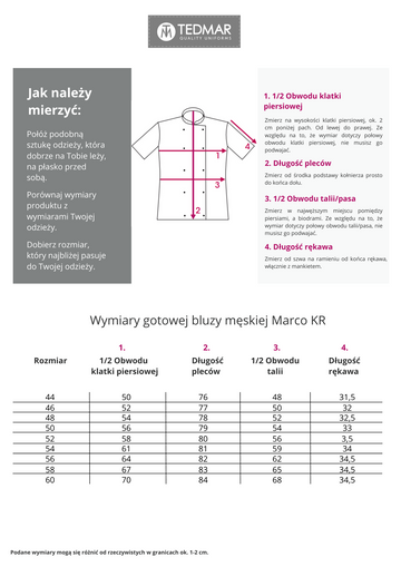 Poszukujesz kitla kucharskiego, który zapewni Ci elegancki wygląd i wygodę podczas pracy w kuchni? Sprawdź naszą nową bluzę kucharską męską Marco! Oto pięć głównych korzyści, jakie oferuje nasza bluza kucharska Marco: Elegancki wygląd: Nasza bluza kucharska jest wykonana z lekkiego i oddychającego materiału, który zapewnia nie tylko wygodę, ale także elegancki wygląd. Z szykowną stójką i krytą plisą z zapięciem na zatrzaski, dwuczęściową kieszenią na ramieniu oraz kieszenią na piersi w eleganckiej ramce, nasza bluza kucharska Marco dodaje wyrafinowanego stylu każdemu kucharzowi. Wygodny krój: Dzięki oddychającemu i elastycznemu materiałowi piqué na plecach, nasza bluza kucharska Marco jest dopasowana i wygodna. Tył, jak również dolna część rękawów, wykonane są z oddychającego materiału, który zapewnia maksymalny komfort i swobodę ruchów. Funkcjonalność: Nasza bluza kucharska Marco posiada praktyczną zapinkę na karku do przypięcia fartucha oraz mankiet zapinany na zatrzaski, co zapewnia klasyczny wygląd i funkcjonalność. Trwałość: Nasz kitel kucharski Marco wykonany jest z wysokiej jakości materiałów, takich jak 65% poliester i 35% bawełna, co gwarantuje trwałość i długotrwałe użytkowanie. Łatwe utrzymanie: Nasza bluza kucharska Marco może być prana w temperaturze do 60 stopni, co zapewnia łatwe utrzymanie i wysoki stopień higieny. Nasza kitel kucharski męski Marco jest przeznaczony dla kucharzy i innych specjalistów z branży gastronomicznej, którzy szukają stylowej, wygodnej i funkcjonalnej odzieży do pracy. Nasz produkt jest idealny do użytku w kuchni, restauracji, hotelu czy innych miejscach związanych z branżą gastronomiczną. Nie czekaj dłużej i zamów naszą bluzę kucharską Marco już dziś! Dzięki niej poczujesz się elegancko i wygodnie podczas swojej pracy, a zarazem zachowasz trwałość i funkcjonalność. Zamów teraz i bądź gotowy do pracy w kuchni! Długość pleców wynosi 79 cm dla rozmiaru 50. Materiał: 65% poliester, 35% bawełna, 150 g/m.kw. Pranie: 60 stopni