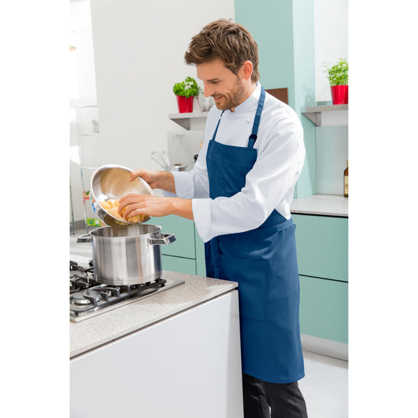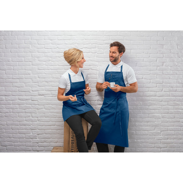 Fartuch z regulacją na szyi (klamerka), dwuczęściową kieszenią na długopis oraz kieszenią na brzuchu. Dostępny w dwóch rozmiarach: 88 x 80 cm oraz 88x100 cm (dł. x szer.). Skład: 65% poliester, 35% bawełna Pranie: 60°C