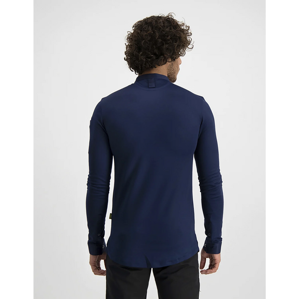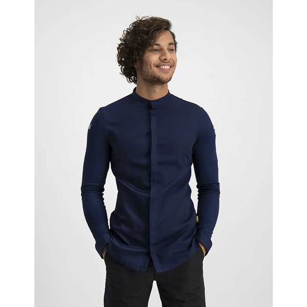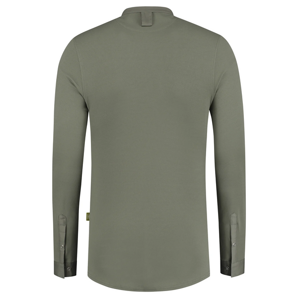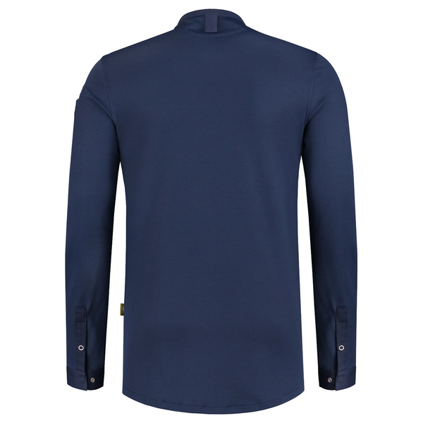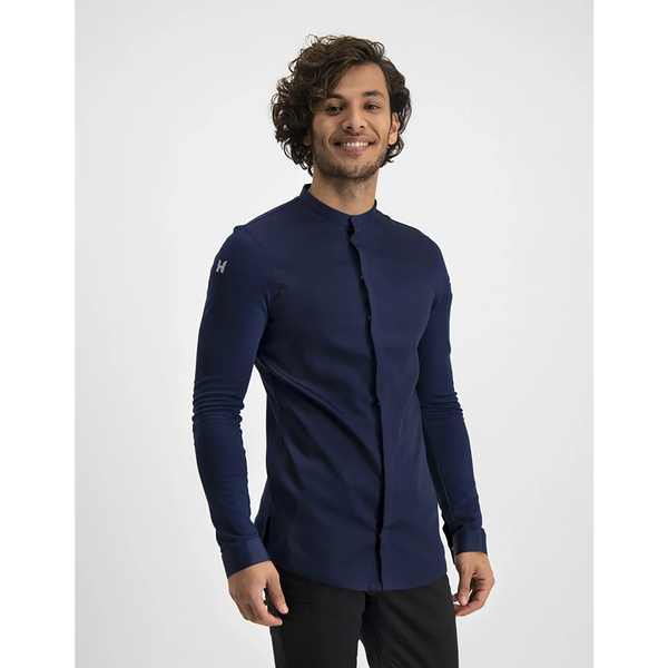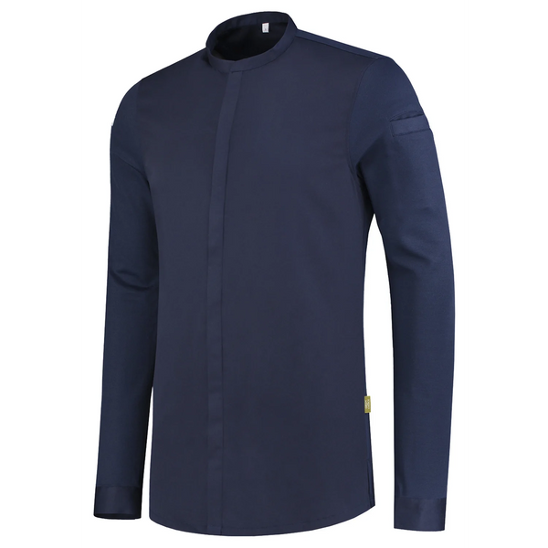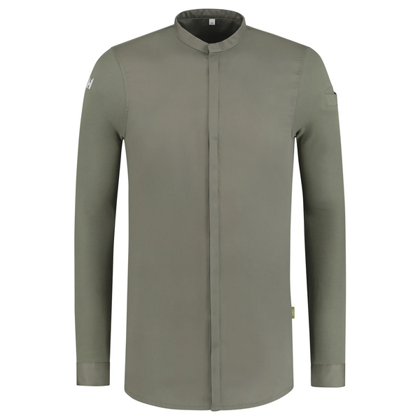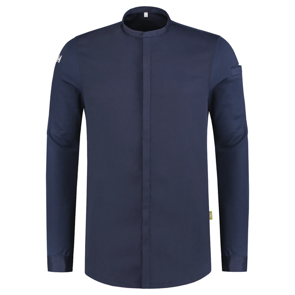 Ekskluzywna bluza kucharska o dopasowanym kroju podkreślającym męską sylwetkę. Bluza posiada elegancką stójkę, kryte zapięcie oraz klasyczne mankiety zapinane na napy. Dodatkowo, na lewym ramieniu znajduje się praktyczna kieszonka. Bluza oferuje najwyższą jakość i optymalny komfort dzięki zastosowaniu wytrzymałego, elastycznego materiału na plecach i rękawach. To wysokiej jakości tkanina, która nie kurczy się i praktycznie nie odbarwia. Zalecamy zamawianie bluz o jeden rozmiar większy niż zazwyczaj. Biały i czarny: materiał główny: 67% polietylen / 33% bawełna Biały i czarny: materiał z tyłu: 55% bawełna organiczna / 45% polietylen z recyklingu Granatowy i oliwkowy: materiał główny: 50% PET / 50% bawełna BCI Granatowy i oliwkowy: materiał z tyłu: 55% bawełna organiczna / 45% polietylen z recyklingu