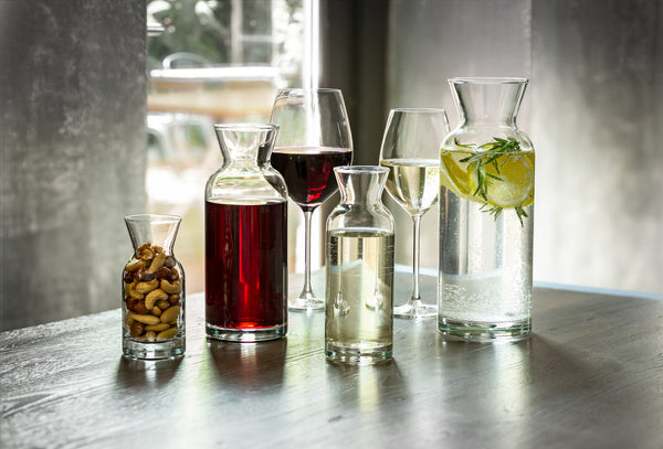 Karafka wykonana ze szkła o nowoczesnym kształcie. Można myć w zmywarce.
