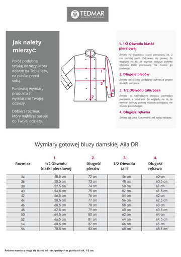 Nowoczesna, wytrzymała damska bluza kucharska z łatwej w pielęgnacji bawełny. Model z długim rękawem posiada dwurzędowe zapięcie na 6 guzików, podwójną listwę guzikową i odpinane guziki kulkowe. Na kołnierzu i brzegu zapięcia znajduje się kontrastowa wypustka. Klasyczna damska bluza szefa kuchni ma naszytą kieszeń na piersi. Długie rękawy wykończone lamówką u dołu mankietu można praktycznie wywinąć. Dostępna również z krótkim rękawem. Prosty krój zapewniający maksymalną swobodę ruchów. Dostawa obejmuej czarne guziki kulkowe. Kontrastowe wypustki: 100% bawełna. 200 g/m². Pranie 60°C. Dł. po plecach kobieta: 73 cm w rozmiarze 36.