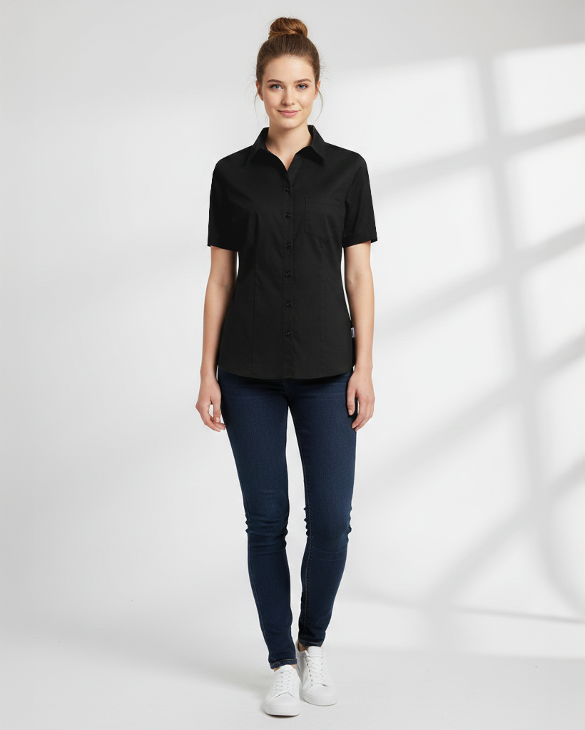 Ponadczasowa bluzka ze elastanem, dzięki czemu ładnie się dopasowuje. Dostępna w wersji z krótkim lub długim rękawem, do wyboru w kolorze czarnym. Posiada praktyczną kieszeń na piersi. Krój lekko taliowany Skład: 97% bawełna, 3% elastan Gramatura: 140 g/m² Pranie w 40°C