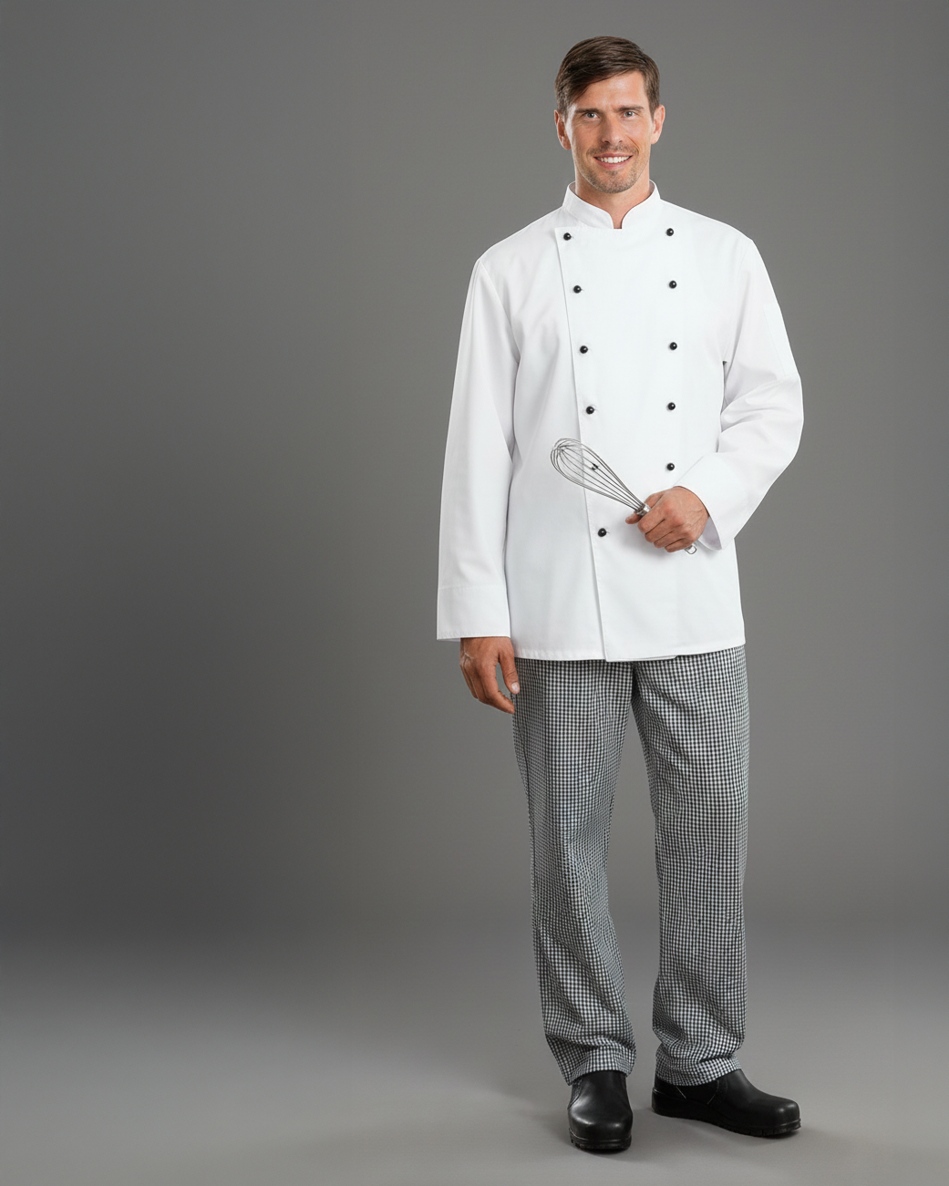 Lekkie spodnie kucharskie o prostym kroju dla kobiet i mężczyzn. Wygodny elastyczny pas ze sznurkiem, dwie kieszenie boczne i jedna kieszeń tylna. 65% poliester, 35% bawełna. 140 g/m². Pranie w 60°. Wewnętrzna długość nogawki: 80 cm w rozmiarze M. Dostarczane w opakowaniu po 3 sztuki.