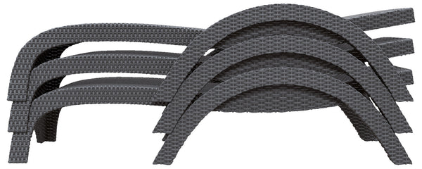 Sonnenliege aus Kunststoff. Rückenlehne in vier Positionen und flach einstellbar. Attraktive Flechtoptik und formschönes Design. Versteckte Rollen an den Füßen und Plastikgleiter. Pflegeleicht, wetterfest und UV-beständig. Für den Außenbereich geeignet. Bis zu zehn Liegen stapelbar. Passende Liegenauflagen separat erhältlich.