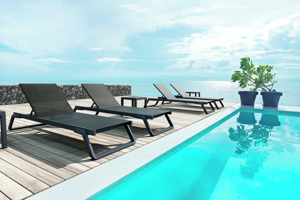 Sonnenliege aus langlebigen, witterungsbeständigen Polypropylen. Liegefläche aus atmungsaktivem Synthetikgewebe. Mit Rollen. Stapelbar bis zu vier Sonnenliegen. Rückenlehne verstellbar in fünf Positionen. Für den Außenbereich geeignet.