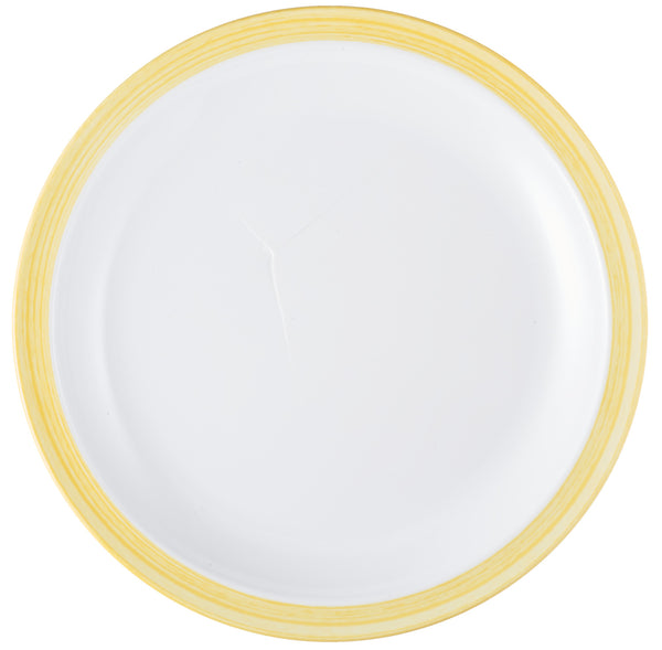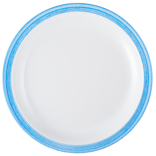 Biały talerz z żywicy melaminowej z kolorową obwódką. Nietłukący. Można myć w zmywarce. Nie nadaje się do mikrofalówki.