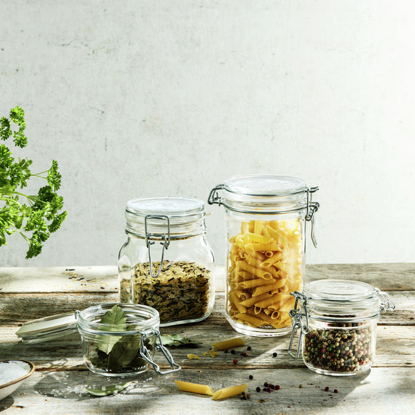 Słoik z wieczkiem wykonany z odpornego na uderzenia szkła, z gumowaną uszczelką i metalowym zawiasem. Idealny do przechowywania żywności. Szkło można myć w zmywarce. Uszczelka i metalowy pierścień nie nadają się do mycia w zmywarce.