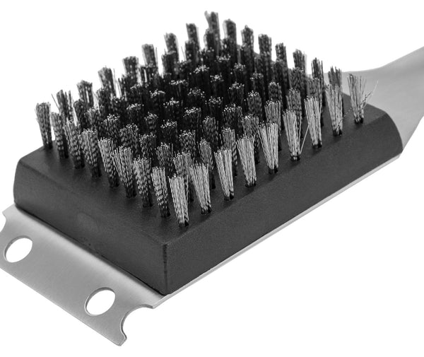 Szczotka do grilla z żaroodporną rączką i pętlą do zawieszania. Włosie ze stali nierdzewnej ułatwia czyszczenie nawet uporczywych resztek z grilla. Z długim uchwytem i antypoślizgową gumową powłoką, która pozostaje chłodna i zapewnia pewny chwyt.