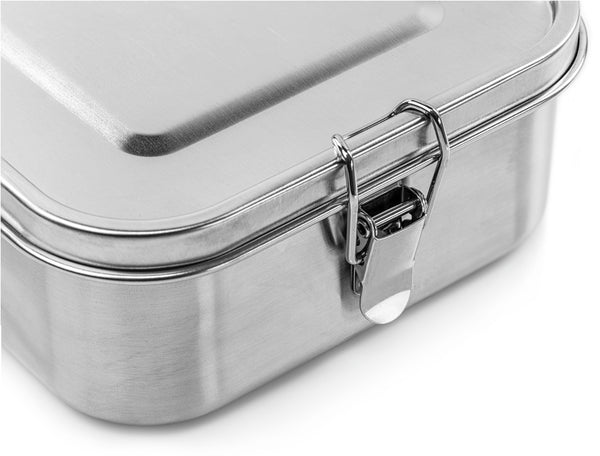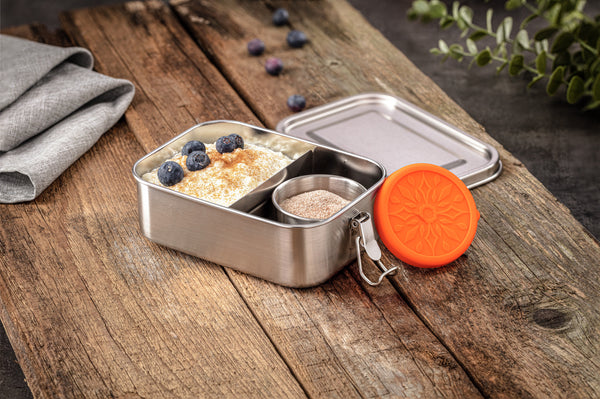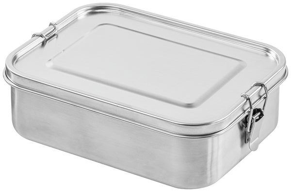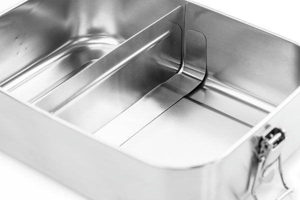 Wytrzymałe pojemniki na lunch wielokrotnego użytku wykonane ze stali nierdzewnej 18/8. Pudełka z higieniczną powierzchnią są idealne do przechowywania różnych rodzajów żywności. Elastyczna przegroda może być używana do oddzielania różnych potraw. Silikonowy pierścień uszczelniający w pokrywie sprawia, że pudełko jest szczelne, dzięki czemu płynne jedzenie może być transportowane bez żadnych problemów. W zestawie 1x przegródka i 1x mini pojemnik na przekąski 100 ml z silikonową pokrywką, np. na dipy, dressingi i sosy. Można myć w zmywarce.