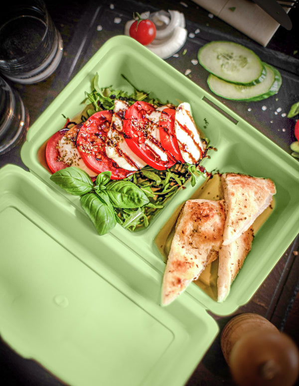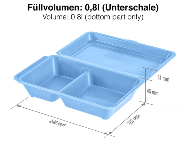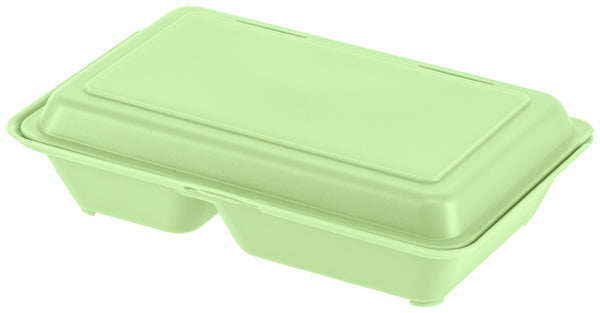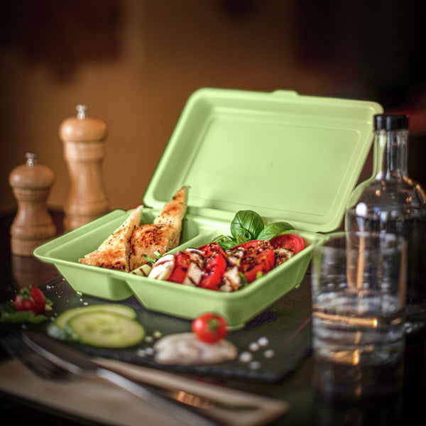 Dwuczęściowe pudełko wielokrotnego użytku wykonane z polipropylenu w 100% nadającego się do recyklingu i nie zawiera BPA. Idealne dla sektora dań na wynos do transportu gorącej i zimnej żywności. Można układać jedno na drugim, używać w kuchence mikrofalowej i myć w zmywarce. Odporność na temperaturę jest gwarantowana w zakresie od 0°C do +110°C. Dostarczane z dołączoną pokrywką. Odporne na rozlanie.