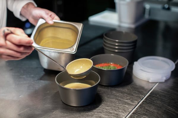Pojemnik wielokrotnego użytku z pokrywką wykonany z biokomórkowego plastiku i włókien drzewnych. Pokrywka ma zintegrowany otwór na etykietę i zamyka się szczelnie. Odporność na temperaturę jest gwarantowana w zakresie od -20 °C do +100 °C. Kompaktowy, nadający się do recyklingu, mycia w zmywarce przemysłowej i użycia w kuchence mikrofalowej (wystarczy odwrócić pokrywkę), nie zawiera BPA ani melaminy.