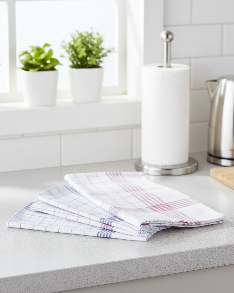 Ściereczki kuchenne w kraciastym wzorze (niebiesko-białym lub czerwono-białym) to idealne rozwiązanie do profesjonalnej kuchni. Wykonane są z wysokiej jakości 100% bawełny, co gwarantuje doskonałą absorpcję i trwałość. Rozmiar około 50 x 70 cm zapewnia wygodę użytkowania, a możliwość prania w temperaturze do 90°C sprawia, że są łatwe w pielęgnacji. Pakowane po 10 sztuk, posiadają zawieszki po obu stronach ułatwiające przechowywanie. Produkt posiada certyfikat Oeko Tex Standard 100, co potwierdza jego bezpieczeństwo dla środowiska i zdrowia. Idealne do użytku profesjonalnego w branży HoReCa oraz do codziennego użytku w domu.