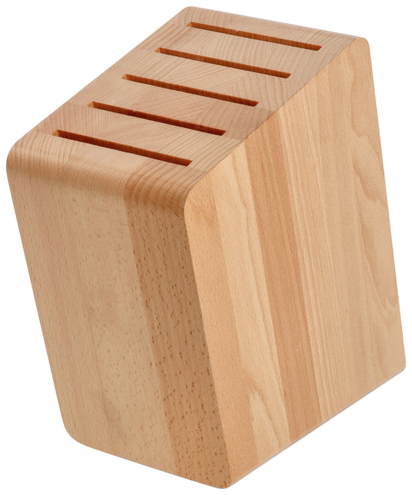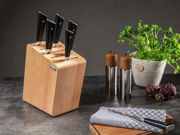 Magnetyczny blok na noże wykonany z olejowanego drewna bukowego na 6 noży i ostrzałkę. Miękkie nóżki na spodzie chronią blat kuchenny. W przypadku naturalnego drewna zaleca się delikatne czyszczenie ręczne.
