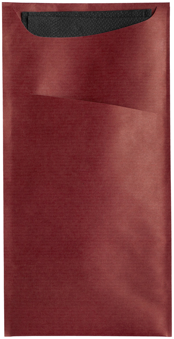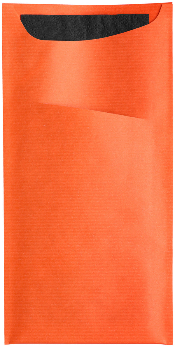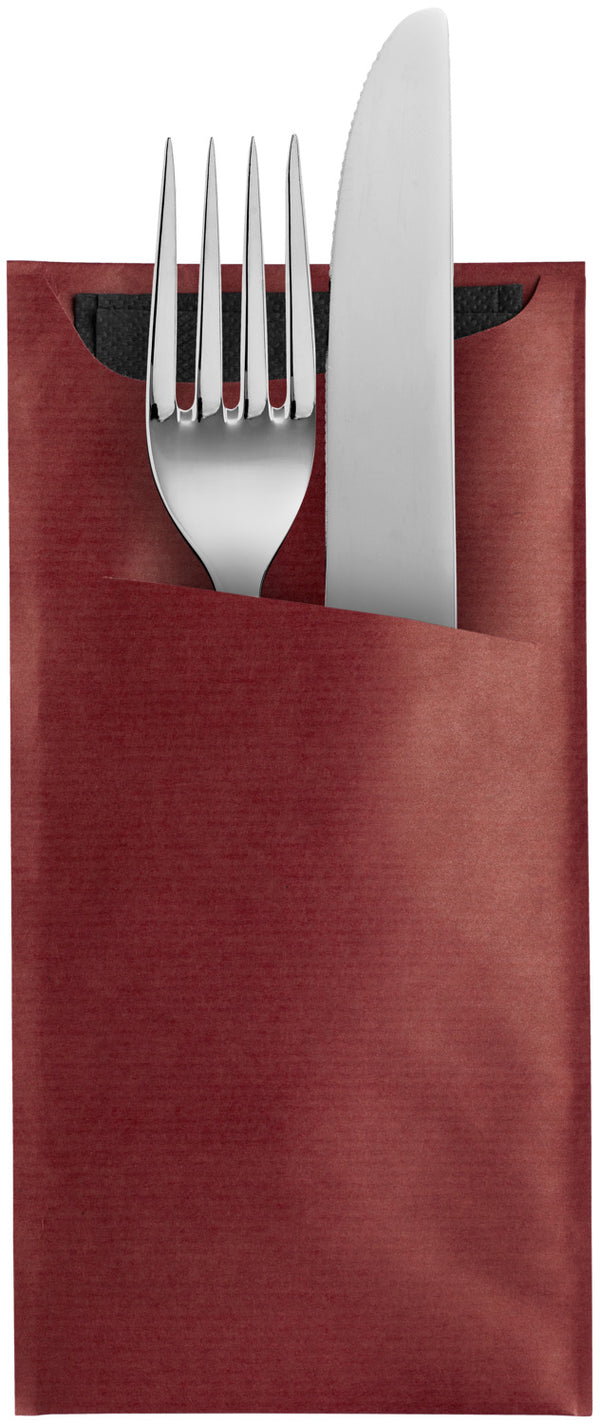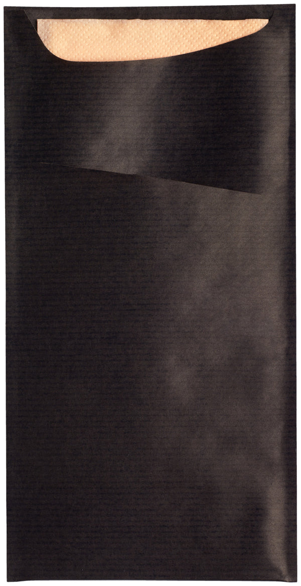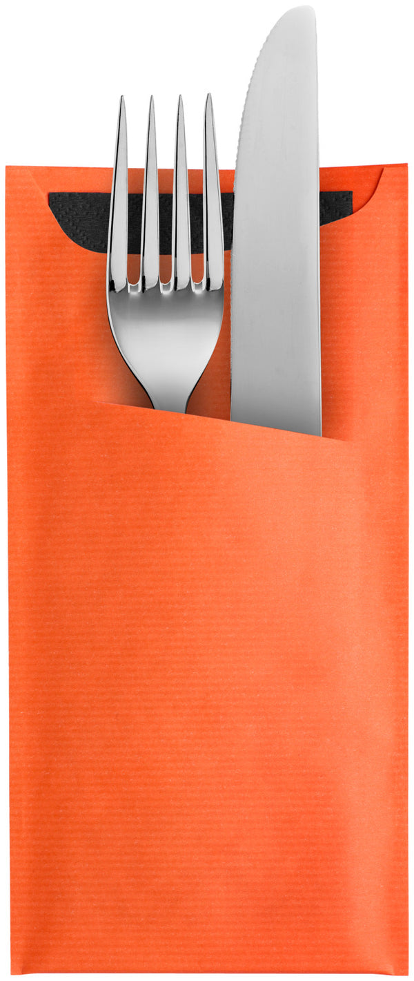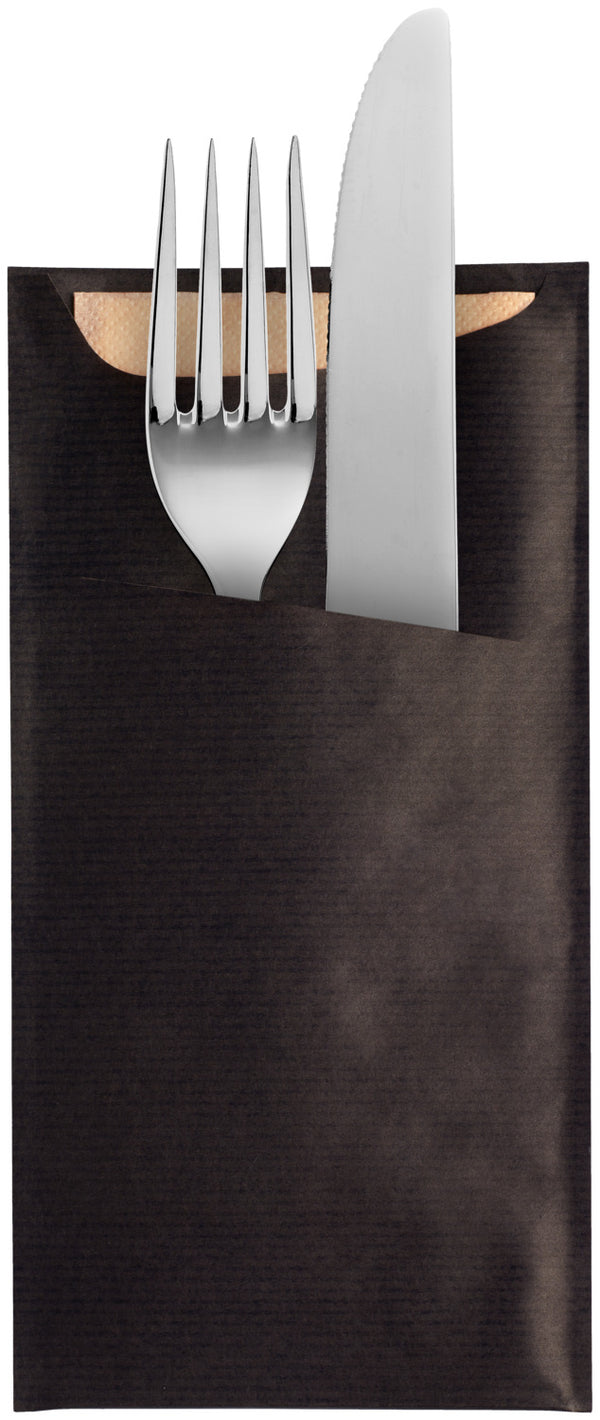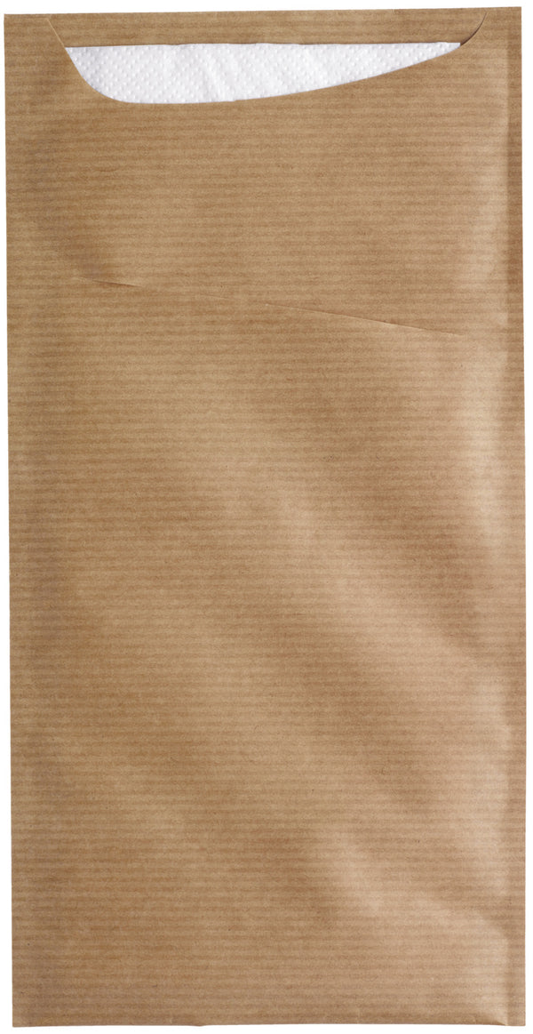 Etui na sztućce wykonane z papieru prążkowanego, papieru kraft i celulozy. Zawiera wkładaną serwetkę.