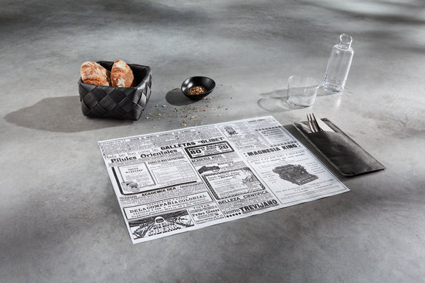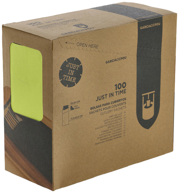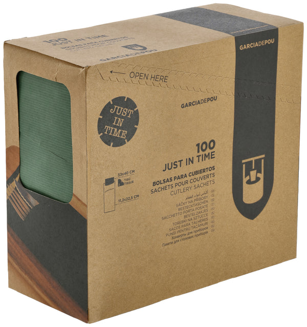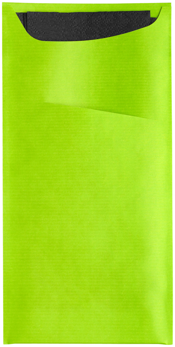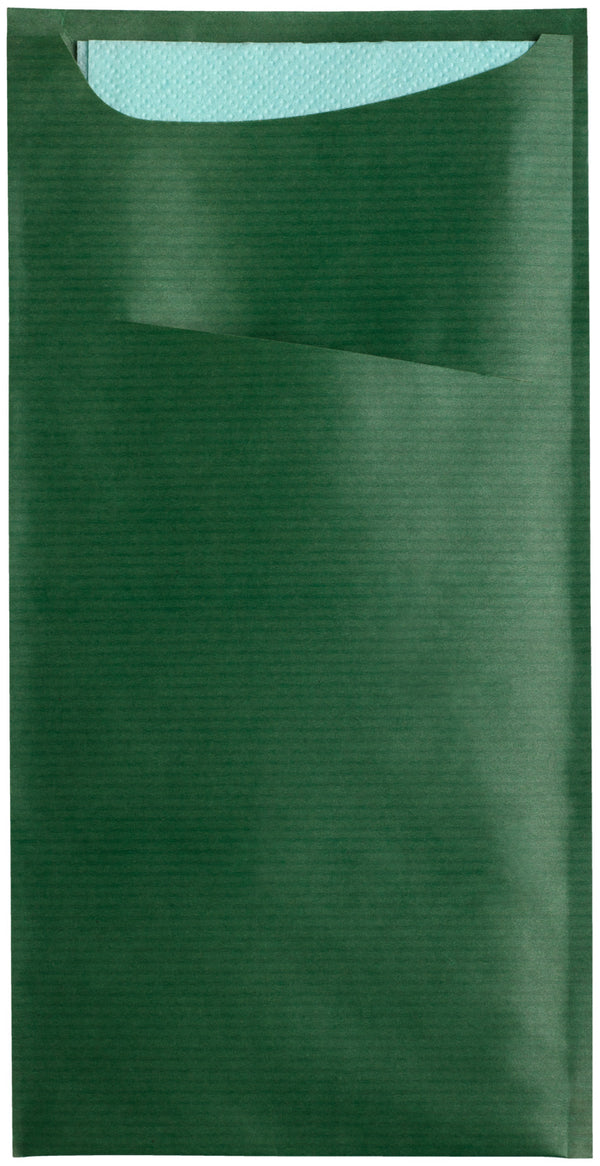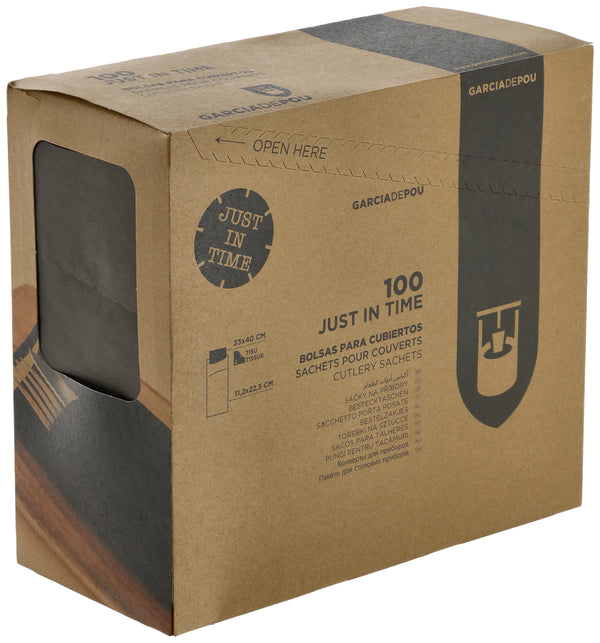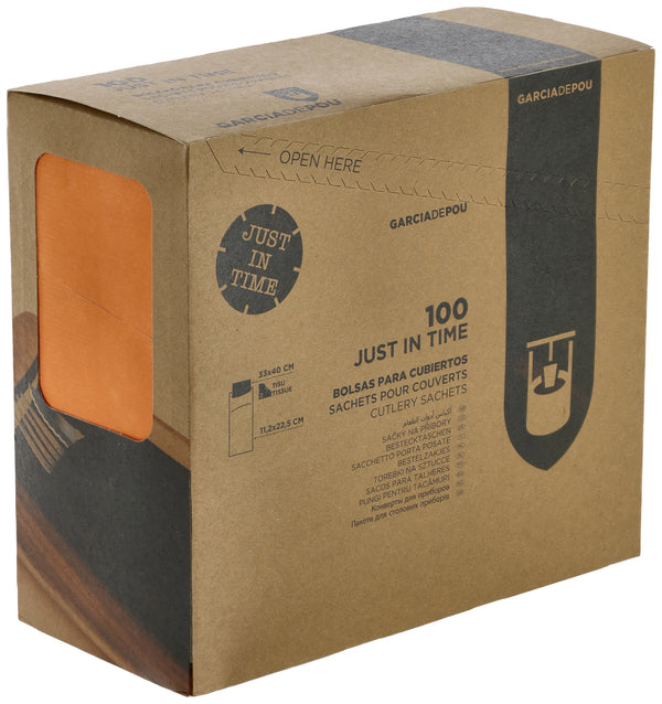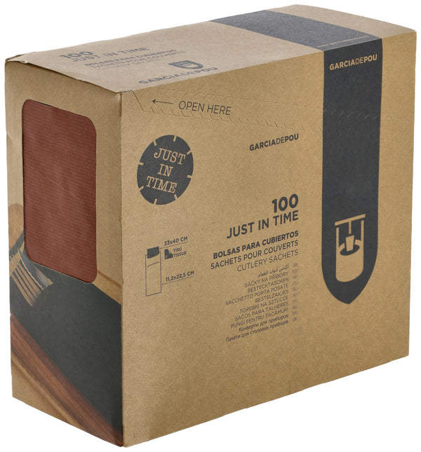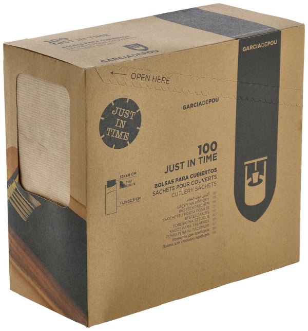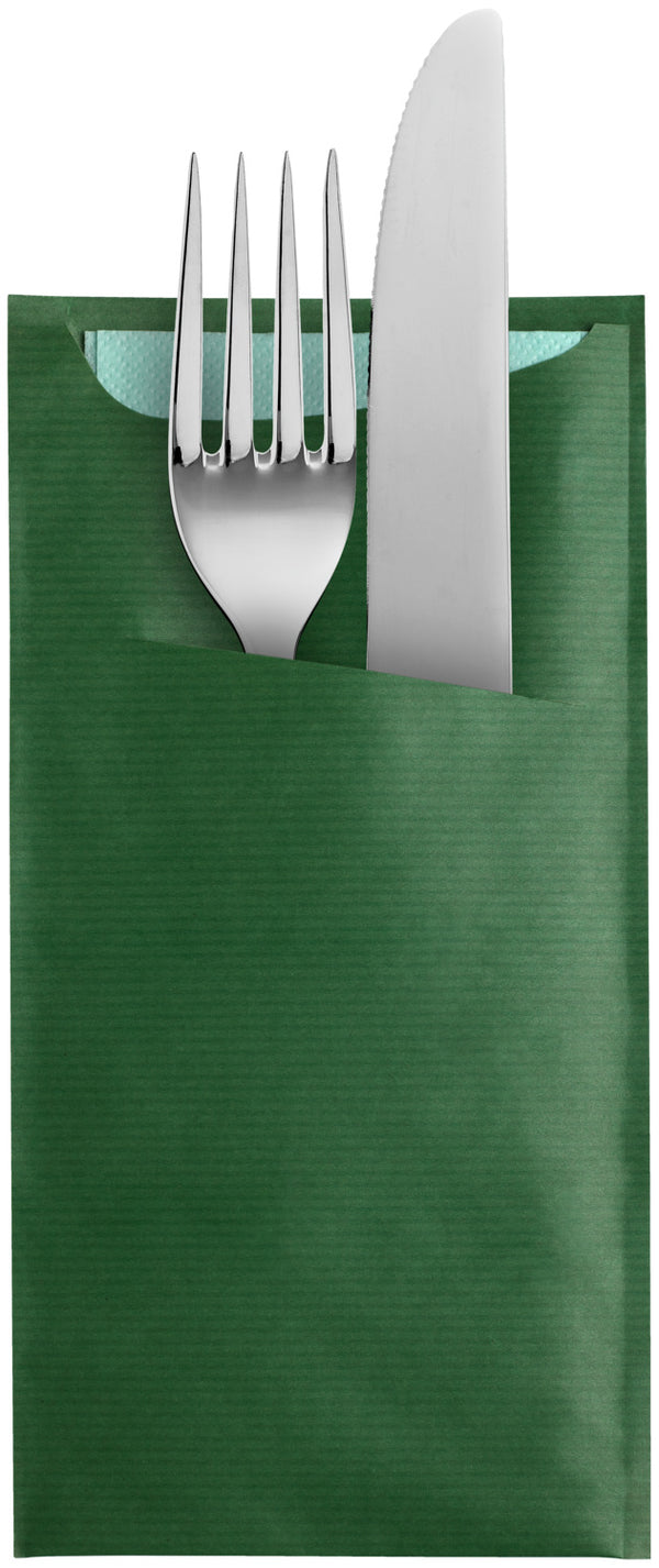Etui na sztućce wykonane z papieru prążkowanego, papieru kraft i celulozy. Zawiera wkładaną serwetkę.