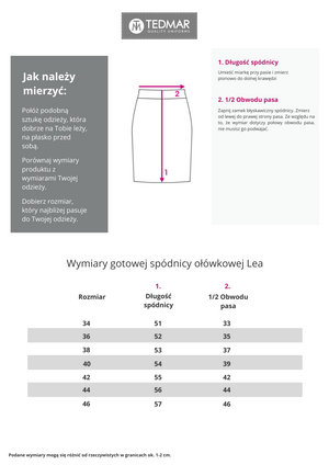 Elegancka spódnica wykonana z tkaniny mieszanej, zapinana na suwak z tyłu. Posiada elastyczny pasek ze szlufkami i wygodne rozcięcie z tyłu. Model na podszewce. Dostępne dwa kolory do wyboru. Pasują do żakietu Lea.