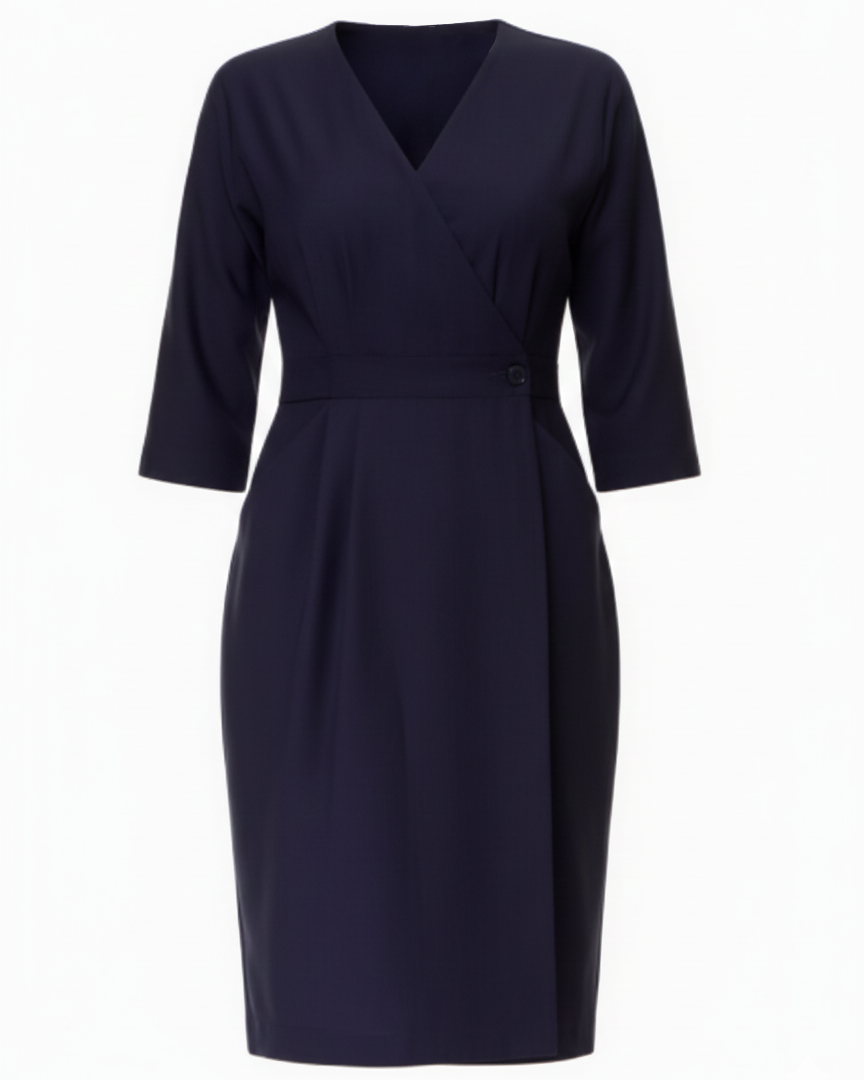 Stylowa sukienka kimonowa z dekoltem w kształcie litery V. Posiada dwie kieszenie i została dopasowana zaszewkami do sylwetki. Model zapinany na guziki.