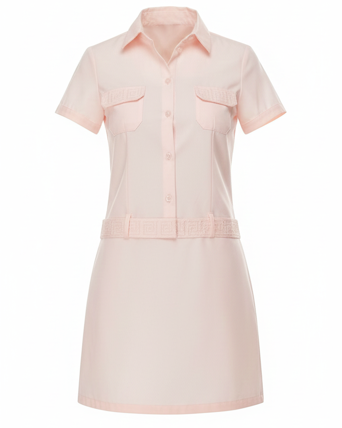 Wygodna sukienka z krótkim rękawem zakończonym mankietem, zapinana na sześć guzików. Posiada kołnierz na stójce i została dopasowana zaszewkami do sylwetki. Może być ozdobiona haftem na pasku i patkach.