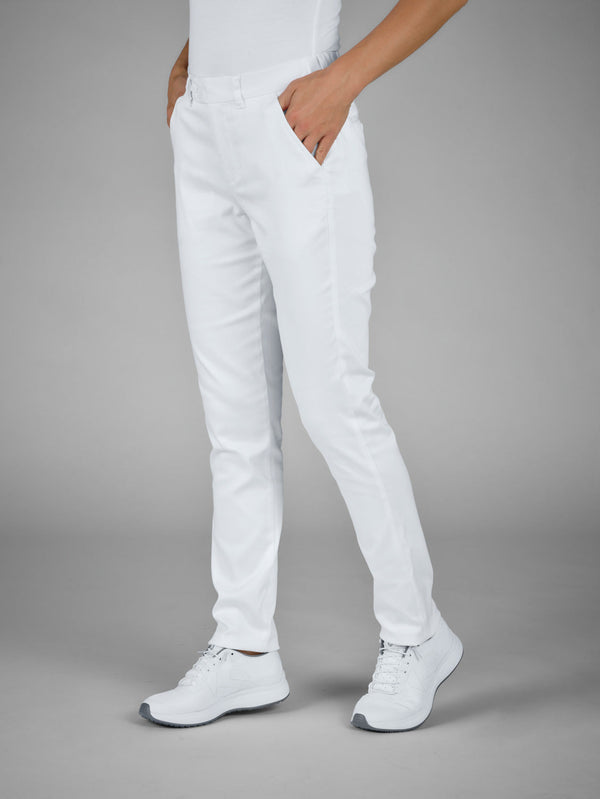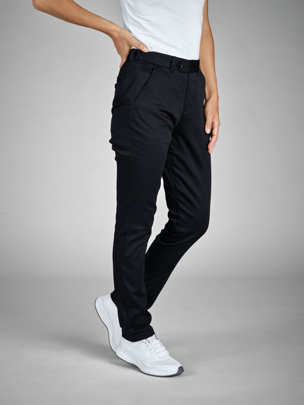 Wygodne chinosy damskie wykonane z oddychającego i funkcjonalnego materiału. Z wygodnym elastycznym paskiem z tyłu, dwiema tylnymi kieszeniami zapinanymi na guziki i dwiema kieszeniami po bokach. W pasie znajdują się szlufki. Spodnie ze średnim stanem i zwężanymi nogawkami. Wewnętrzna długość nogawki: 80 cm w rozmiarze 36. Tkanina 69% bawełna, 28% poliester, 3% elastan. Pranie w 60°.