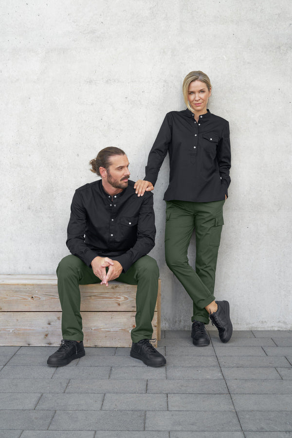 Sportowe damskie spodnie szefa kuchni wykonane z funkcjonalnego i lekko elastycznego materiału ripstop. Z dwiema dużymi naszywanymi kieszeniami cargo na nogawkach i wygodnym elastycznym pasem z tyłu. Posiadają również dwie tylne kieszenie zapinane na guziki, boczne kieszenie i szlufki w pasie. Wygodny krój z lekko zwężanymi nogawkami. Wewnętrzna długość nogawki: 80 cm w rozmiarze 36. 64% poliester, 34% bawełna, 2% elastan. 230 g/m². Pranie w 60°.