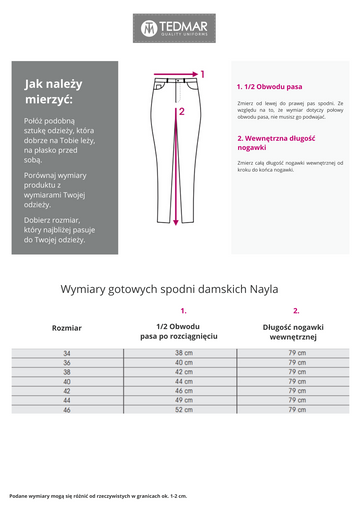 Modne spodnie damskie ze zwężaną nogawką, kieszeniami bocznymi oraz szlufkami do paska. Z tyłu naszyte kieszenie z patkami. W pasek wszyta taśma z gumy, zapobiegająca wysuwaniu się bluzki. Długość nogawki wewnętrznej: 79 cm w rozmiarze 36. Skład: 38% poliester, 30% wełna, 30% wiskoza, 2% elastan. Pranie w 30°C, program delikatny