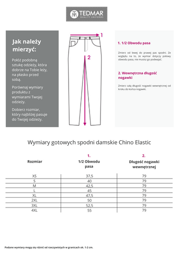 Spodnie damskie typu chino o wyszczuplonym kroju. Posiadają dwie kieszenie z przodu i dwie z tyłu oraz szlufki do paska. Tkanina bawełniana z dodatkiem elastanu jest przewiewna i miła dla ciała, a dodatkowo zapewnia swobodę ruchu.