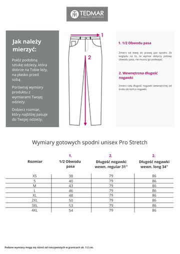 Wytrzymałe i trwałe spodnie cargo wykonane z materiału zapewniającego swobodę ruchu i zaprojektowane z myślą o praktyczności, z wieloma kieszeniami i przydatnym kółkiem D do wieszania niezbędnych rzeczy. Spodnie cargo są popularnym wyborem noszonym przez osoby pracujące w produkcji, budownictwie i konserwacji ze względu na wytrzymały materiał. Zaprojektowane jako model unisex sprawdzą się jako uniform dla całego zespołu. Dostępne w dwóch kolorach, dwóch długościach nogawek i szerokiej gamie rozmiarów. Spodnie wyposażono w pas zapinany na dwa guziki z zamkiem błyskawicznym oraz w dwie kieszenie skośne z przodu, dwie kieszenie cargo na udach i jedną kieszeń naszywaną z tyłu.
