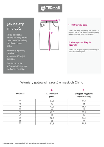 Klasyczne szorty męskie o prostym kroju wykonane z elastycznego, miękkiego materiału. Z tyłu kieszenie w ramce zapinane na guziki, po bokach kieszenie skośne i zintegrowana kieszeń na długopis po prawej stronie. Talia wykończona szlufkami na pasek. 97% bawełna, 3% elastan. Pranie delikatne w 30°. Wewnętrzna długość nogawki: 29 cm w rozmiarze 50